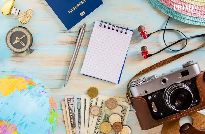 Travel essentials – passport, money, pen, compass, usb, earpiece