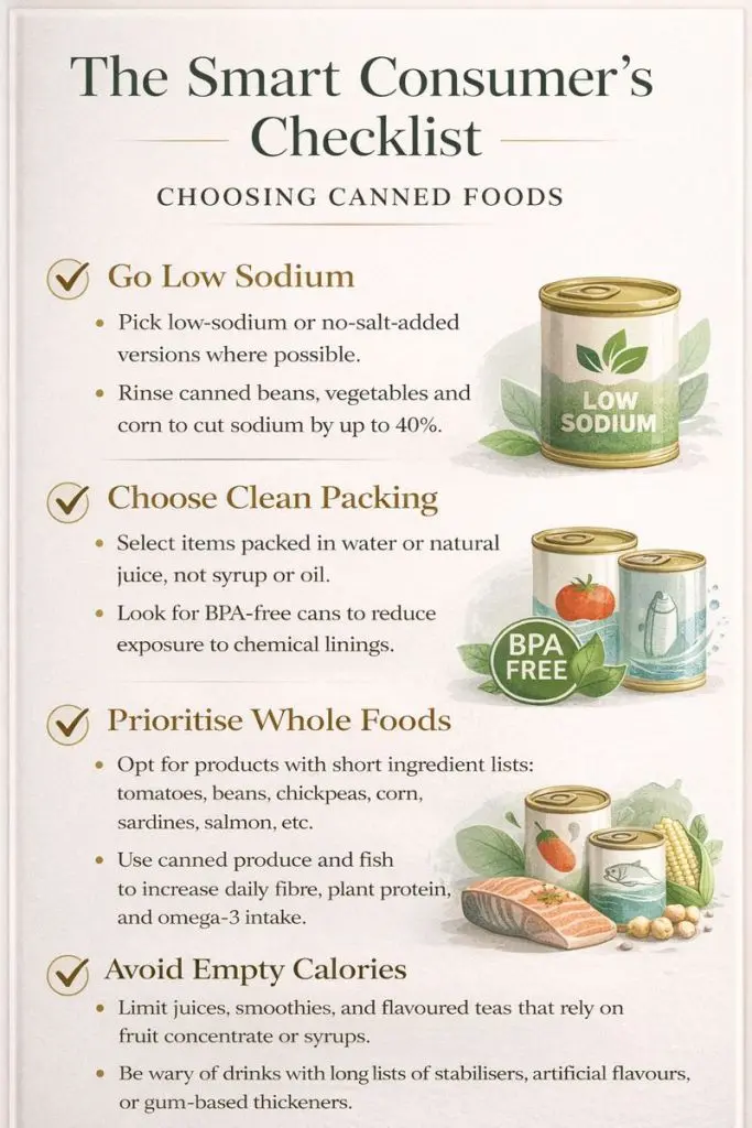 Similarly, canned legumes remain excellent sources of plant-based protein and folate. Rinsing them before use reduces sodium content without causing significant nutrient loss. Together, these findings reinforce a broader principle in dietetics: the health impact of canned food depends more on product choice and preparation than on the canning process itself.