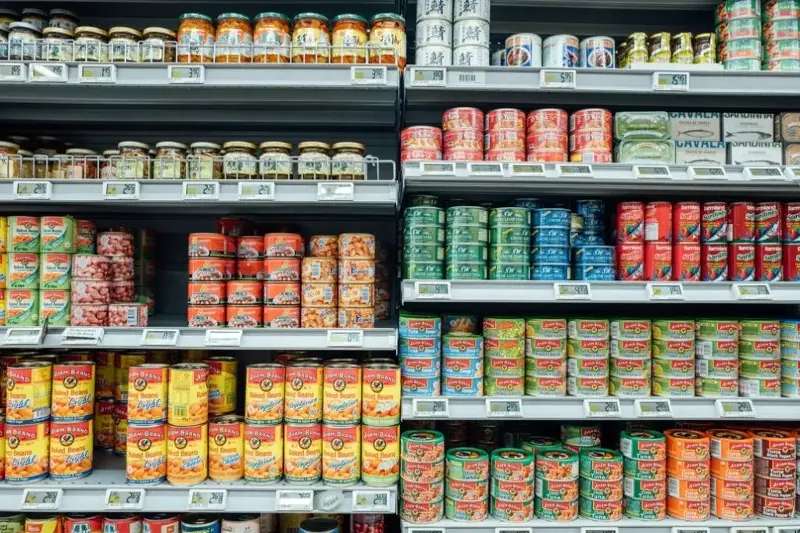 Canned goods display in a supermarket