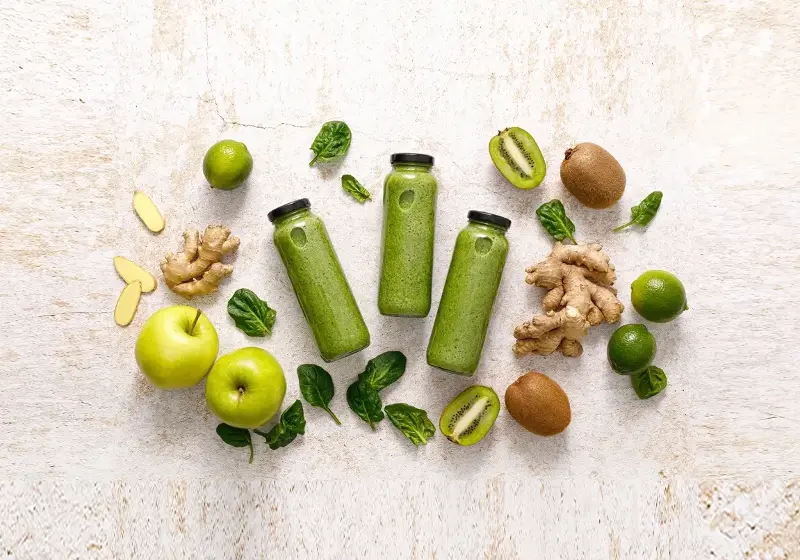 Smoothie. Healthy fresh raw detox spinach smoothie with green apple, kiwi and ginger in a bottles on a table. Healthy diet vegan food full of antioxidants