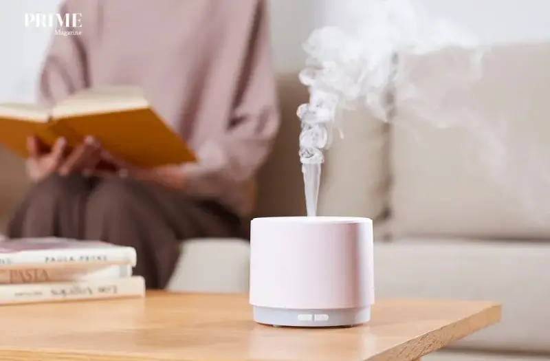 Aromatherapy Diffuser Releasing Steam with a Reader in the Background