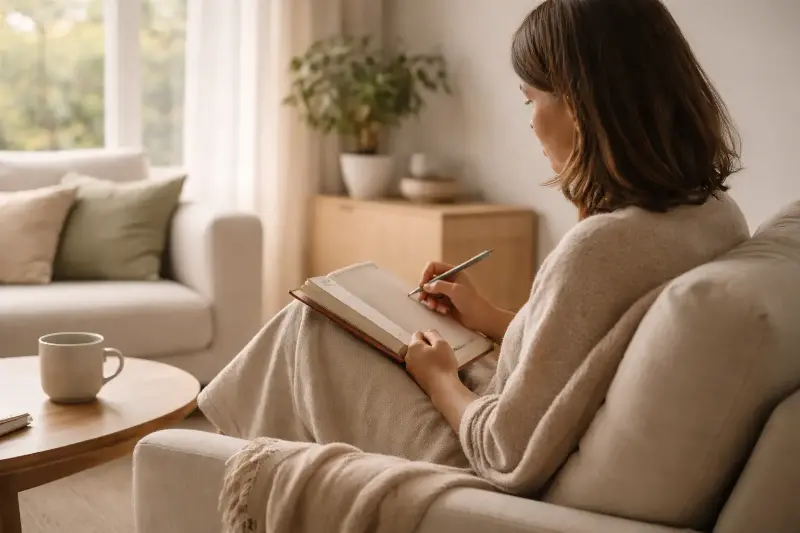 Person sitting quietly with a notebook or journal, no phone