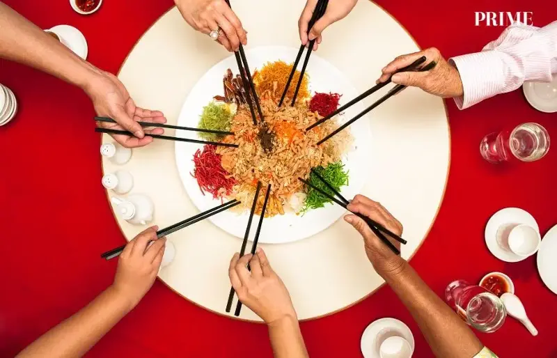 Sharing yusheng — a toast to prosperity and togetherness.