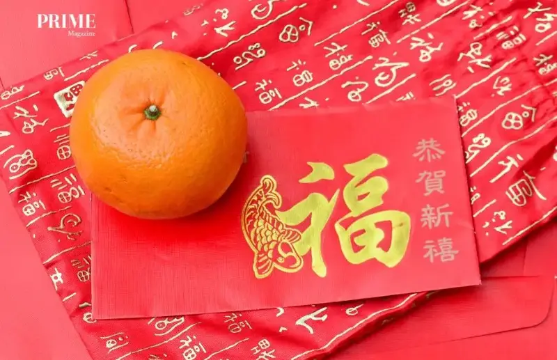 Mandarin orange and red packet