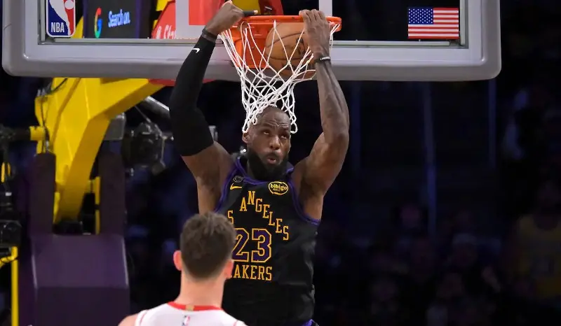 Houston briefly captured the lead in the third period before the Lakers used a 13-4 burst — highlighted by a spectacular reverse dunk from 41-year-old James after he blew by Durant — to pull ahead 67-59.