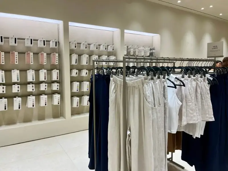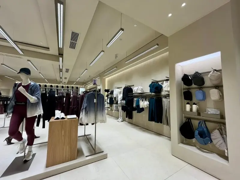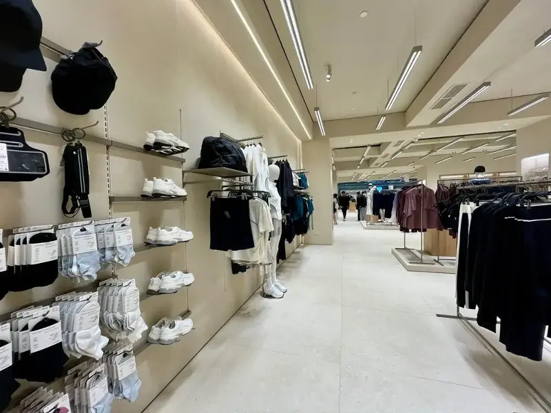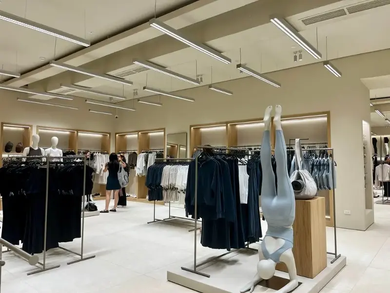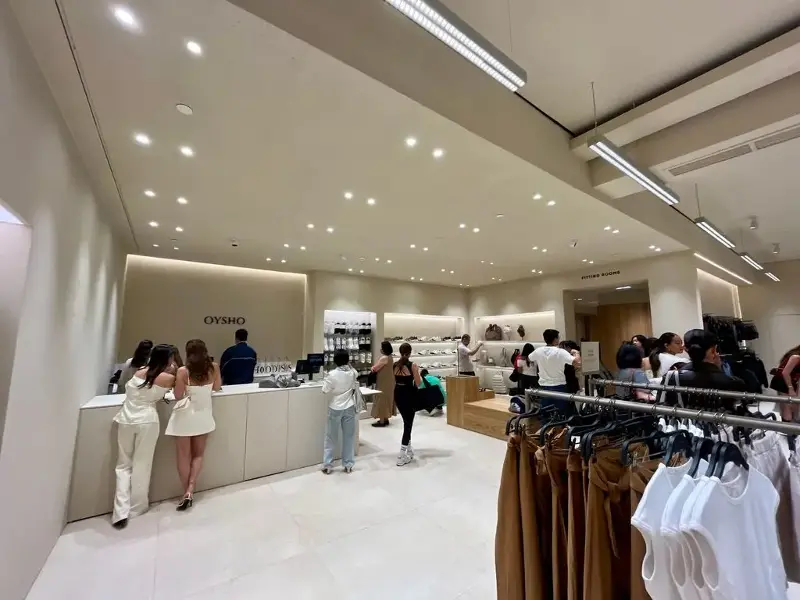 Oysho’s façade, clad in natural stone, resembles the modern look of newer ZARA branches in the Philippines. Inside, minimalist interiors and a custom linear lighting system unify the space.