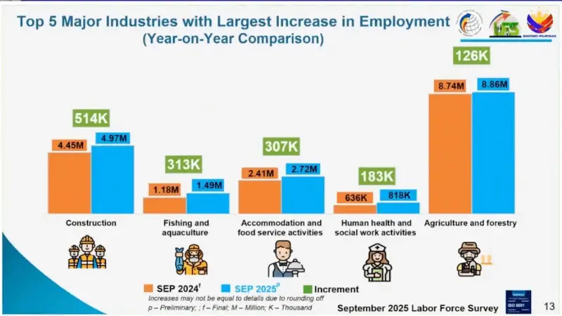 National Statistician Dennis Mapa highlighted gains in the jobs related to the construction of buildings, plumbing, and air conditioning installation, as well as the construction of utility projects.
