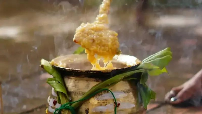 When Pongal is cooked outdoors on firewood, flames handle the pot unevenly, creating a mild smoky flavour that layers the dish with rural depth. The ghee melts differently, spices bloom gradually, and rice absorbs the heat slowly, letting flavours rounder and more prominent. Unlike the gas stoves that you can control, open fires demand attention- stirring, adjusting the wood and examining the boil. This hands-on process changes cooking into a shared ritual, where taste is shaped by patience, intuition, and the crackling of fire.