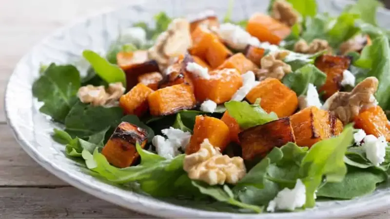 This salad is like a cosy bowl of comfort and not a 'diet food'. Pieces of sweet potato and cooked chickpeas are tossed in olive oil, chilli flakes, garlic, and cumin, then roasted till the edges are caramelised. They are tossed warm with some lemon juice, chopped with some coriander leaves, and a handful of crunchy nuts or seeds. The sweet–spicy taste, soft centres, and crisp edges make it extremely satisfying to enjoy on a cold winter evening. It is filling to have for dinner and also light enough that you will not feel lethargic after.