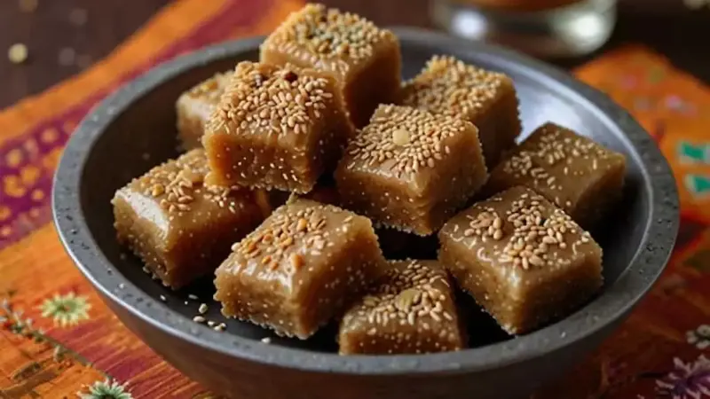 Unlike the traditional laddoos, til-gul vadi is set flat, cut into a square shape, and often prepared in advance for the Sankranti festival. Prepared by melting jaggery and mixing it with roasted sesame seeds, peanuts, and often dry coconut, the mixture is flattened and sliced when it is warm. The taste is earthy, nutty, and intensely caramelised, with a slight chew that you will enjoy. This dish is easy to distribute, store for a longer time, and share as a token of love with your loved ones.