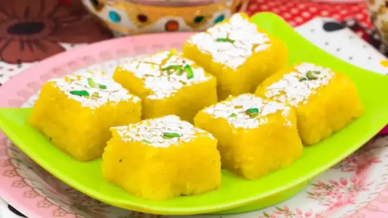 Khobra Pak is a classic Maharashtrian winter sweet where fresh coconut is slow-cooked with jaggery, ghee, and cardamom until it gets a thick and fudge-like consistency. While sesame is seen everywhere on Sankranti, coconut perfectly balances the heat with its richness and moisture. The preparation demands patience, stirring until the mixture leaves the pan, making it a work-of-love sweet. Soft and thick, khobra pak can be cut into diamond shapes before serving.