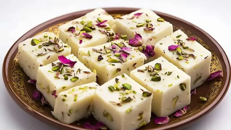 One of the most iconic sweets made from curdled milk in Rajasthan is Alwar ka mawa. This dessert was reportedly prepared in 1947 by Baba Thakur Das in Alwar, when the milk curdled unexpectedly. What makes it distinctive from all other desserts is its appearance, having = a mix of white and light brown with caramelised tones that give it a rich, layered look. To make it, milk is boiled and then reduced, then curdled using an acidic agent such as lemon juice or alum. The curdled milk is then cooked slowly with sugar and ghee until it has a thick consistency. The final texture of Alwar Ka mawa feels soft and granular, almost fudge-like.