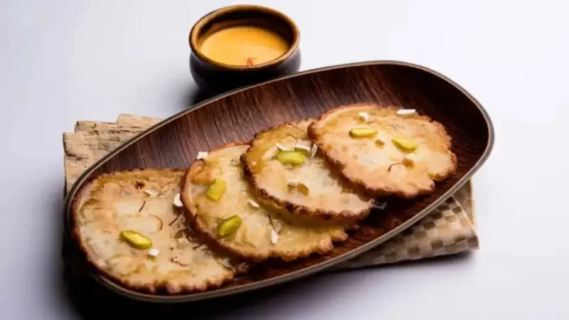 Rich, decadent malpuas, when paired with chilled rabri served in tiny cups, it is a potluck showstopper that is decadent and fun. The malpuas are crisp from the edges, gooey on the inside, and soaked in syrup, infused with cardamom and saffron fragrance. The creamy rabri strikes a perfect balance of texture and flavour that feels festive in every bite.