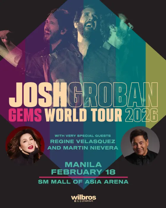 Tony, EMMY and five-time GRAMMY Award-nominated singer-songwriter Josh Groban brings his newest tour ‘GEMS WORLD TOUR’ to Manila and announces his very special guests ‘Asia’s Songbird’ Regine Velasquez and ‘Concert King’ Martin Nievera for a must-see Valentine’s week concert on February 18, 2026 at the SM Mall of Asia Arena. Presented by Wilbros Live.