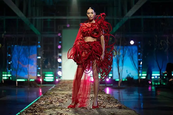 “Something Wicked” – Avant-Garde Storytelling Inspired by the theme “Wicked for Good,” Floresca hand-sewed a fully avant-garde look using 100 yards of rigilene boning wrapped in red silk, layered with sheer tulle. The design evoked unraveling and movement.