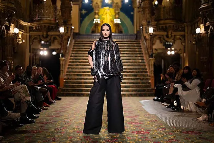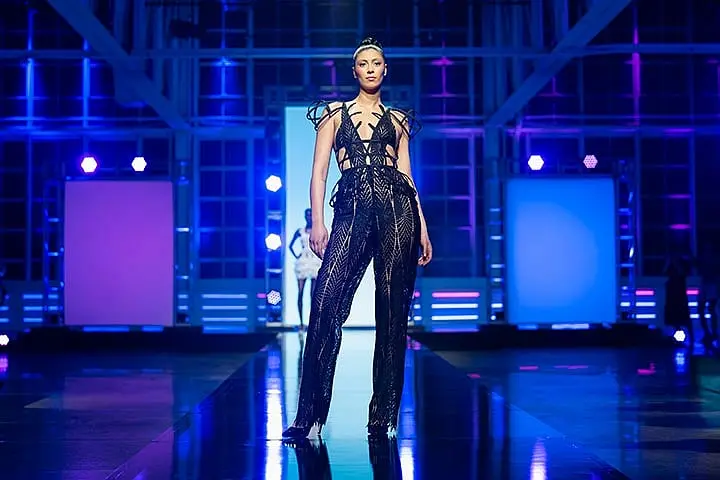 “Hit the Streets” – Elevated Streetwear Floresca drew inspiration from workwear uniforms to design a cropped jacket in raw denim and leather, paired with geometric jeans constructed from 24 panels. The look fused modernity and innovation, two things she’s known for as a designer.
