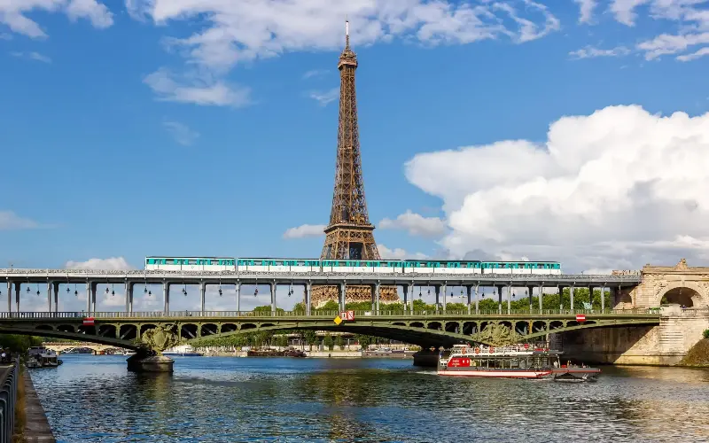 The southbound part of Line 6 between Passy and Bir-Hakeim where the train bursts from between the buildings to reveal the Eiffel Tower on the far side of the Seine.