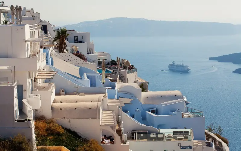 A 10-night Santorini & Athens sailing departing July 11, 2027, costs from £2,600pp for an oceanview cabin. Excludes flights.