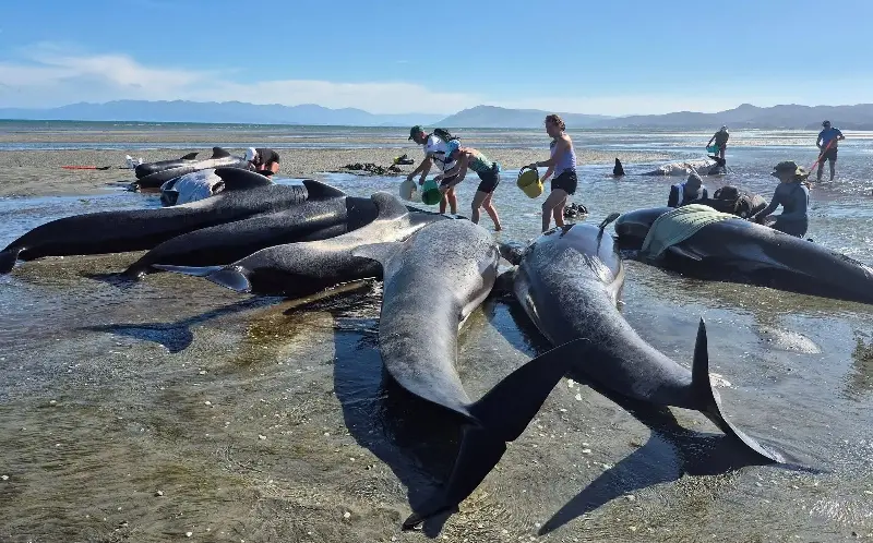 Project Jonah, a New Zealand marine rescue organisation, said that, with the help of 200 volunteers, most of the stranded whales “slowly but steadily headed out to deeper water [with a bit of encouragement]”.