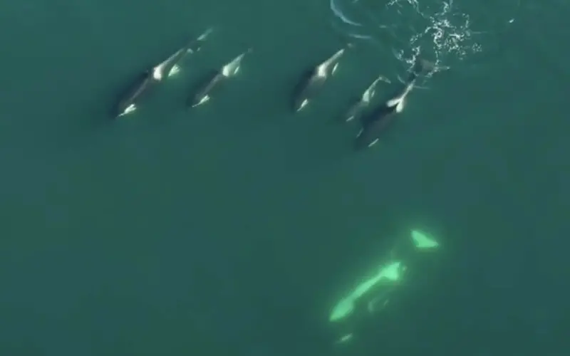 The species were first observed working together by Keith Holmes, a drone pilot at the Hakai Institute, a scientific research institution.