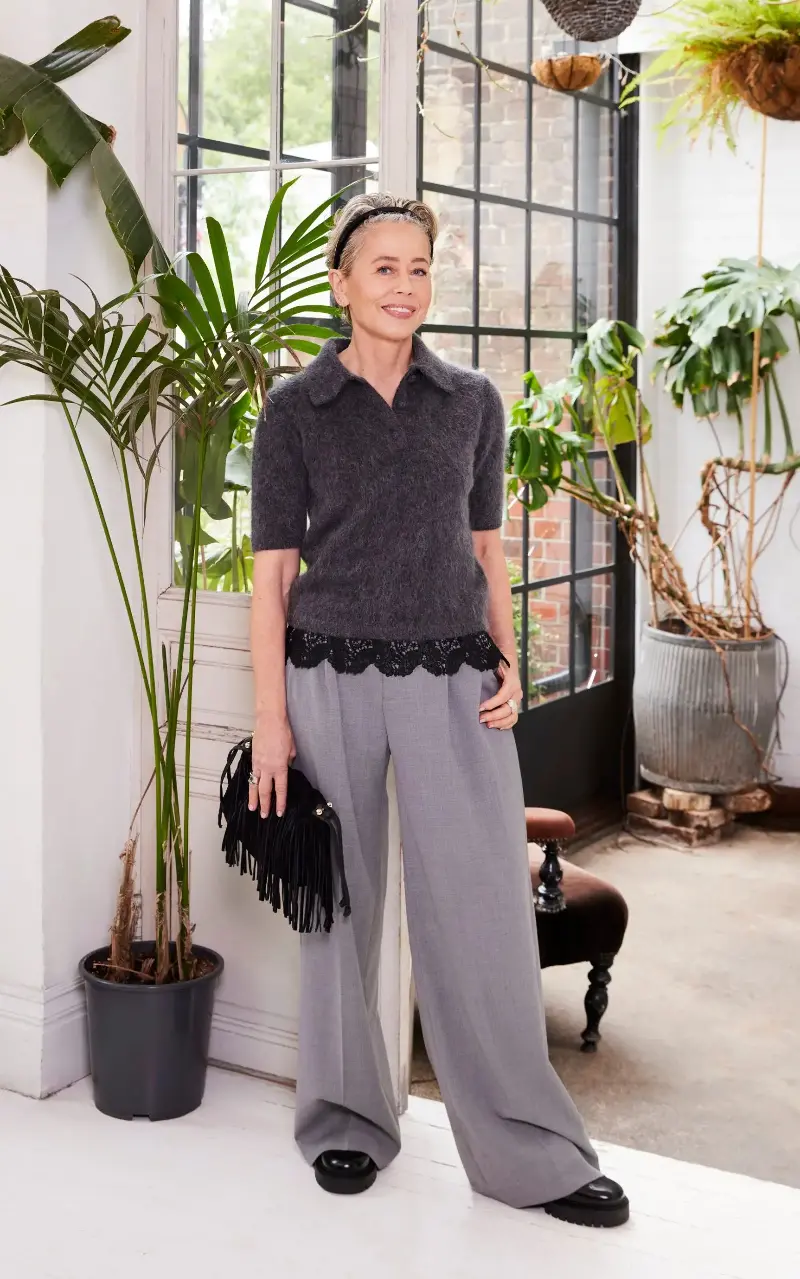 Recycled sterling-silver ring (right hand), £200, Carolina de Barros; Steel ring (left hand), £55, Edblad; Earrings, Lisa’s own; Velvet headband, from a selection, Etsy; Wool-blend polo, £77, & Other Stories; Lace-trim camisole, £150 (on sale for £105), Me+Em; Flannel trousers, £140, Reiss; Leather shoes, £175, Sézane; Suede bag, £325, Strathberry