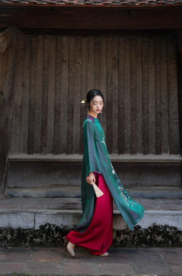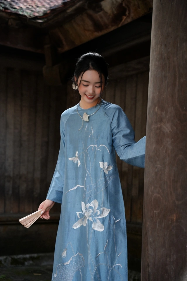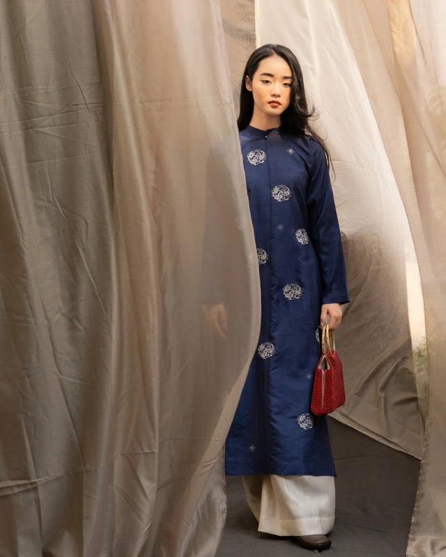 The use of hand-woven and hand-dyed silk is not merely a trend-following endeavor, but also contributes to promoting and developing the local economy . Nha Xa silk, with its characteristic matte sheen, is fully utilized for its soft drape, supporting the traditional five-panel silhouette and classic straight-cut styles.