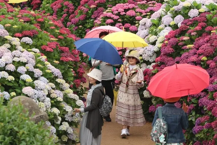 Tourists use umbrellas to shield themselves from the rain while sightseeing on Jeju Island, South Korea, on June 12, 2025. Photo: Yonhap/VNA