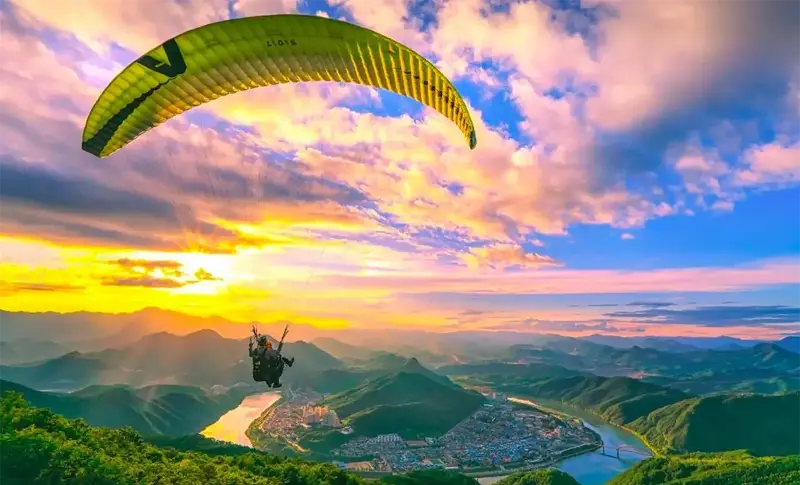 Danyang is a Korean tourist destination with paragliding activities. Danyang's mild weather and ideal geographical conditions can bring a great paragliding experience to visitors. This experience is especially interesting in autumn, when the surrounding mountains gradually change color to brilliant yellow and red.