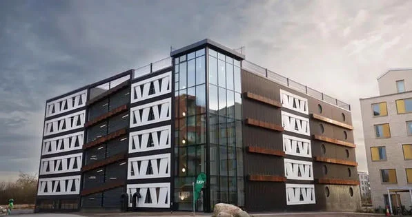 Located in the Brunnshög planning area of Lund, the new Niels Bohr parking garage makes a strong impression thanks to its unique structure. The building utilizes 57 wind turbine blades salvaged from the decommissioned Nørre Økse Sø wind farm of the Vattenfall energy group. Instead of being discarded, they were repurposed to create "screen walls"—a non-load-bearing cladding that encloses a large portion of the building's facade.