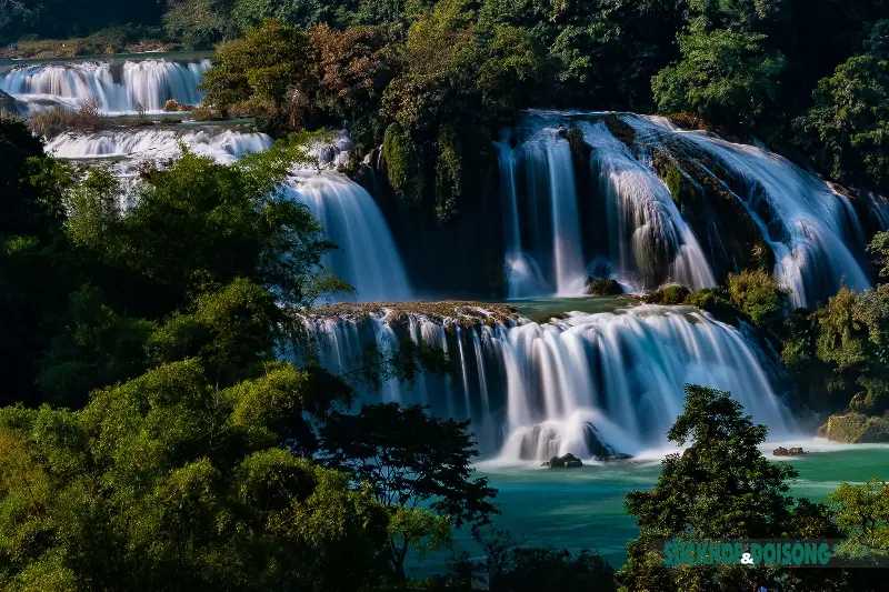 The waterfall is over 60m high, with many levels pouring down large limestone blocks, creating a majestic scene in the middle of the northern mountains and forests.