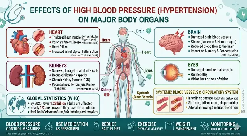 High blood pressure silently damages many vital organs.