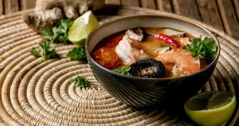 The sweet, sour, spicy, and salty flavors in this soup broth perfectly complement the sweet, tender shrimp. Aromatic ingredients include galangal, lemongrass, and kaffir lime leaves, while slices of bright red chili peppers add a touch of spiciness. Tom yum goong is just one of many variations of Tom yum soup in Thailand.