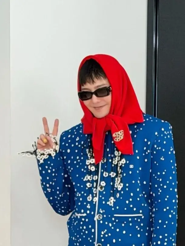 Another image features G-Dragon revisiting his iconic scarf styling, a detail long associated with his personal fashion identity. Dressed in black slacks and a jacket accented with blue polka dots and daisy motifs, he adds a red scarf over his head to complete the look.