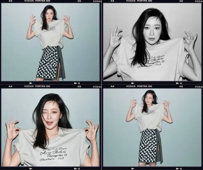 In the photos, Kim Hee-sun is seen wearing a casual T-shirt paired with a skirt featuring bold, artistic patterns. The styling strikes a balance between relaxed and expressive, allowing her natural presence to take center stage. She alternates between playful expressions and calm, composed poses, showcasing a wide emotional range within a minimalist setup.