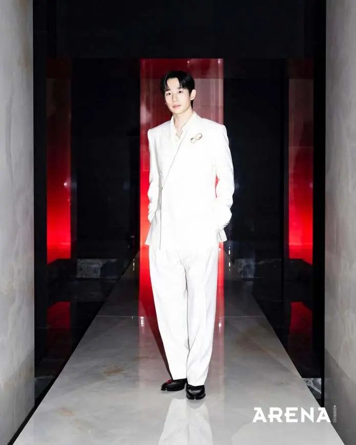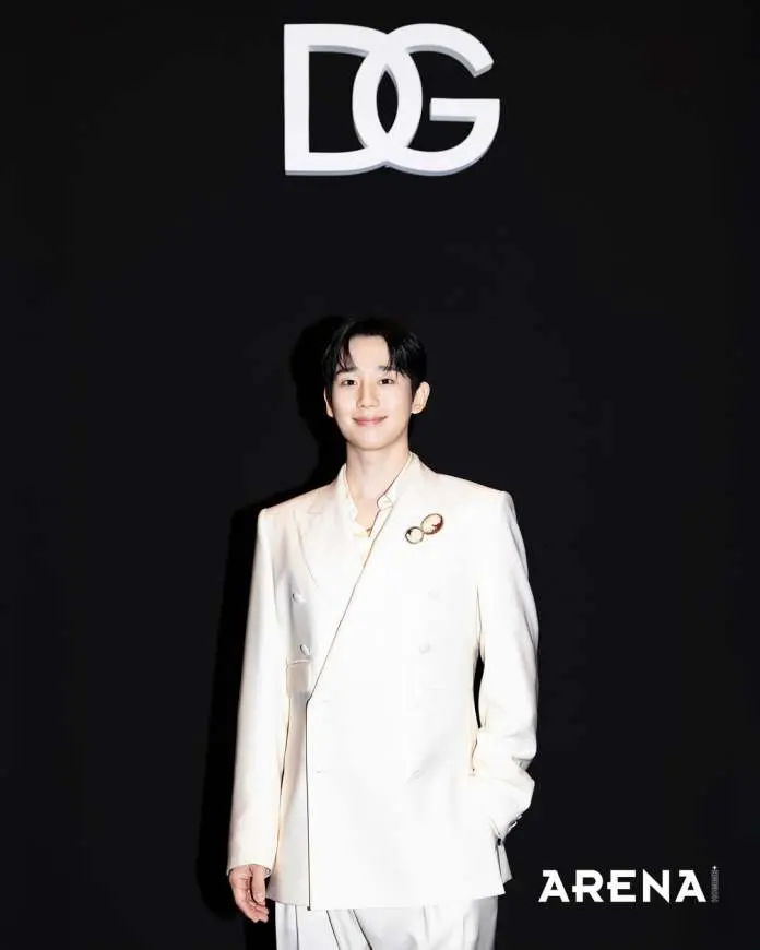 For the event, Jung Hae-in stepped out in a pristine white suit from Dolce & Gabbana’s SS26 sartorial line. The structured silhouette highlighted the suit’s luxurious texture, while a silky shirt layered underneath added a soft, elegant contrast. A cameo brooch served as a subtle yet striking accent, elevating the look with a timeless, artistic touch.