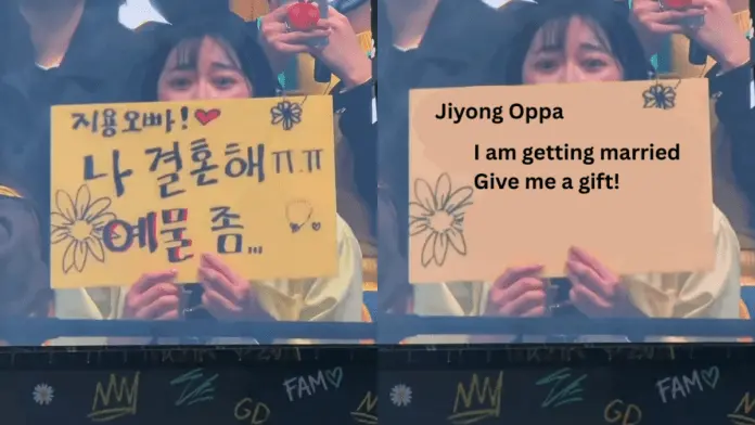 At a recent fan meeting, G-Dragon once again demonstrated why his connection with fans extends beyond performance and celebrity. During the event, a fan held up a simple handwritten placard that read, “Jiyong oppa, I’m getting married. Please give me a gift.” What followed was an unscripted moment that quickly spread across social media not for extravagance alone, but for its symbolism.